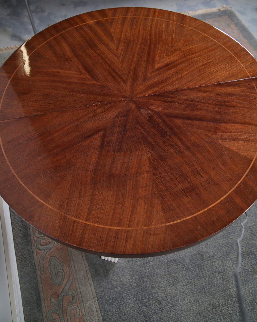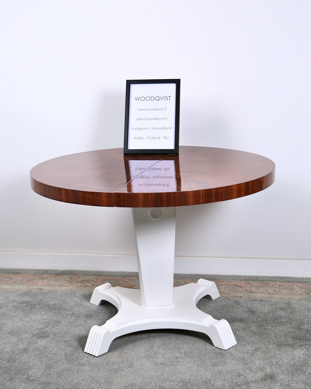 Hirveästi hommaa, monia työvaiheita ja viiluakin piti hieman korjata. Viilunkorjauksesta ei tullut ihan niin huomaamaton, kuin olisi toivonut, mutta se on huomioitu hinnassa. Pöytälevy on nyt lakattu kirkkaalla ja kiiltävällä huonekalulakalla moneen kertaan.