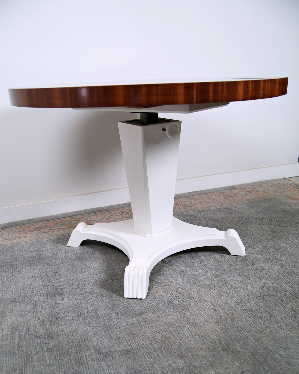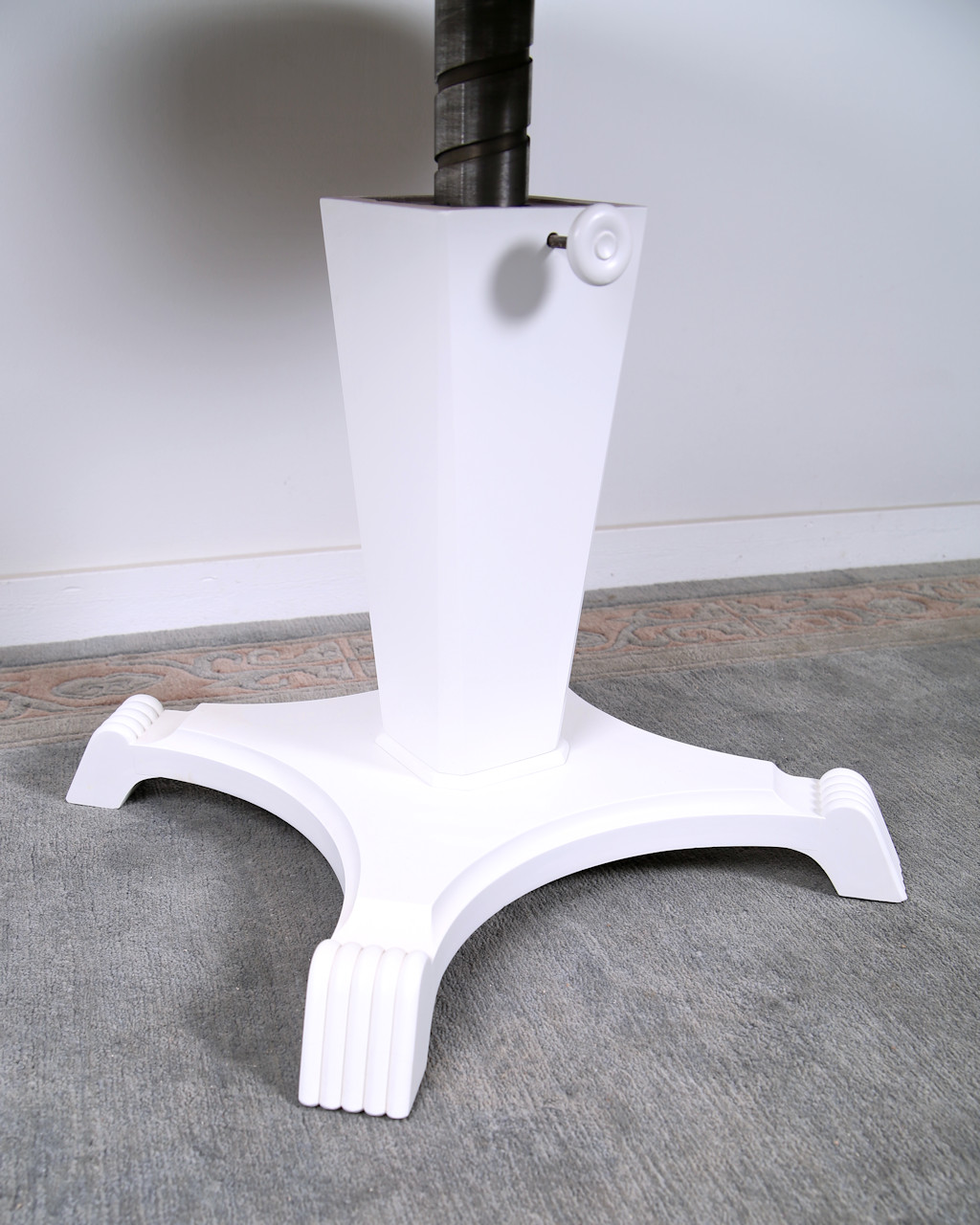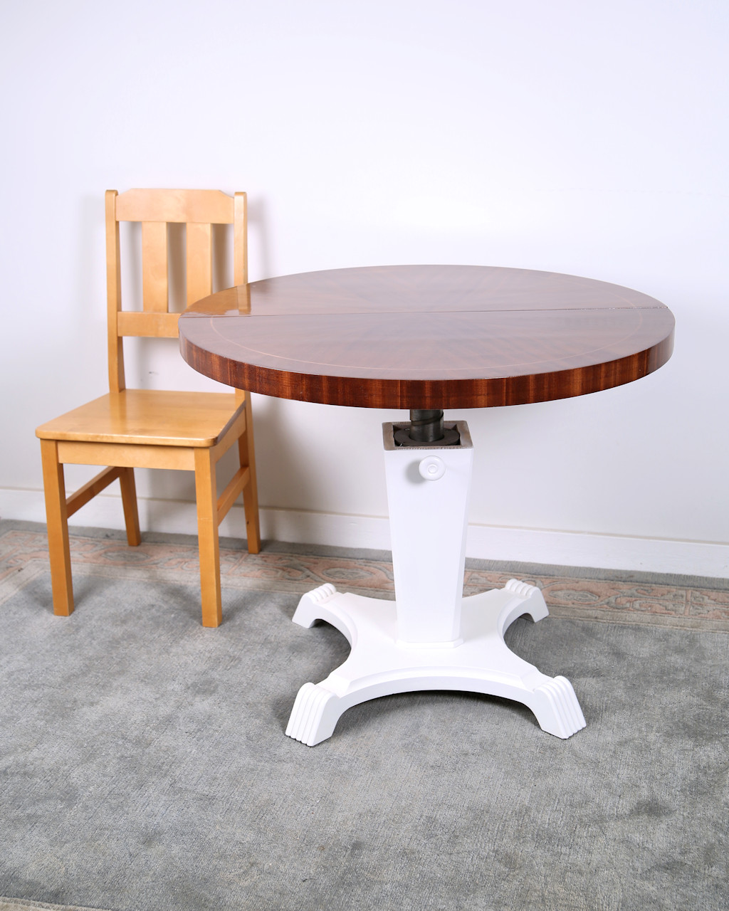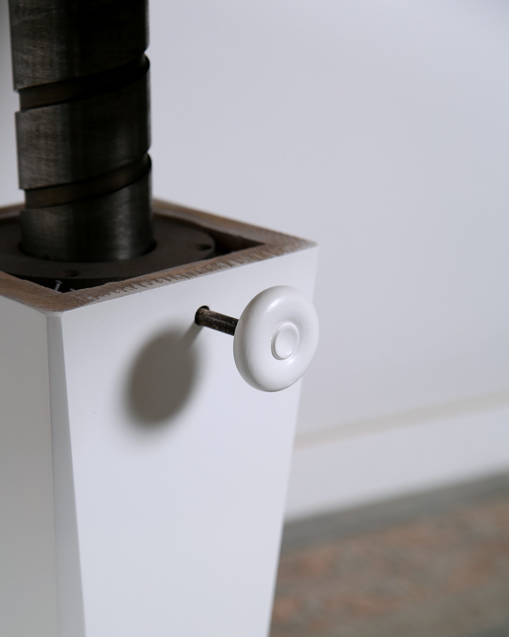 Pöydässä on tukeva korkeudensäätö, joka on toteutettu painavalla ja paksulla metalliakselilla. Korkeuden voi lukita helposti kierretangolla (valkoinen puunuppi) halutulle tasolle.